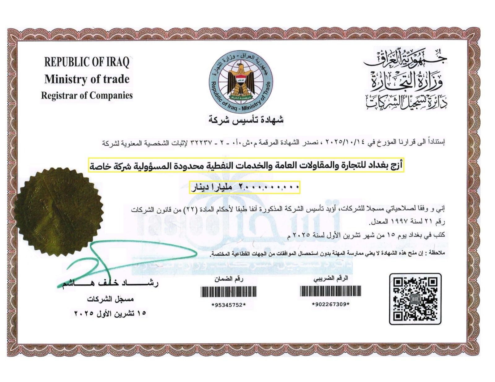 تأسست شركة أزج بغداد (AZJ Baghdad) كشركة عراقية رائدة برأس مال مدفوع قدره 2,000,000,000 (مليارا دينار عراقي)، لتكون شريكاً استراتيجياً في نهضة قطاع البنى التحتية والطاقة في العراق. نحن متخصصون في تقديم حلول متكاملة تشمل المقاولات العامة، التجارة، والخدمات اللوجستية والهندسية للحقول النفطية.